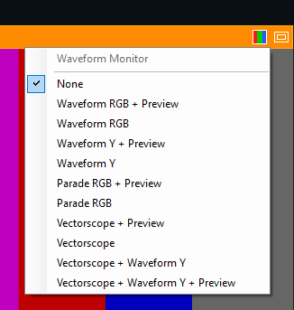 The professional waveform monitor can be turned on within the Preview window and the Input settings window by clicking the colour bar icon as shown below.